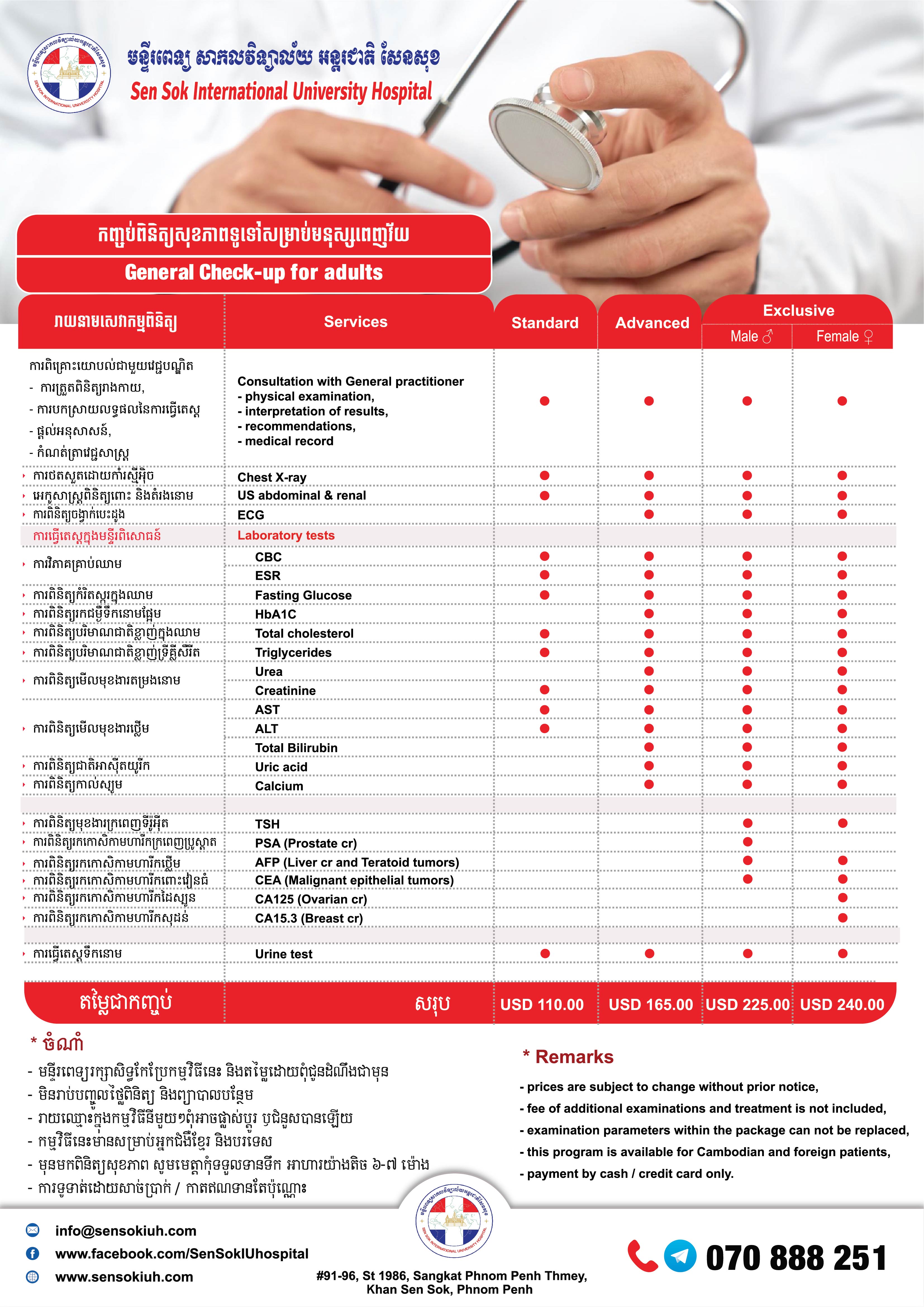 ការការពារប្រសើរជាងការព្យាបាល។ កញ្ចប់ពិនិត្យសុខភាពទូទៅរបស់យើង ត្រូវបានរចនាឡើងយ៉ាងយកចិត្តទុកដាក់ ដើម្បីផ្តល់ជូនអ្នកនូវរូបភាពច្បាស់លាស់អំពីស្ថានភាពសុខភាពបច្ចុប្បន្ន ចាប់ពីមុខងារសរីរាង្គសំខាន់ៗ រហូតដល់ការស្វែងរកហានិភ័យនៃជំងឺផ្សេងៗដែលមិនទាន់ចេញរោគសញ្ញា។