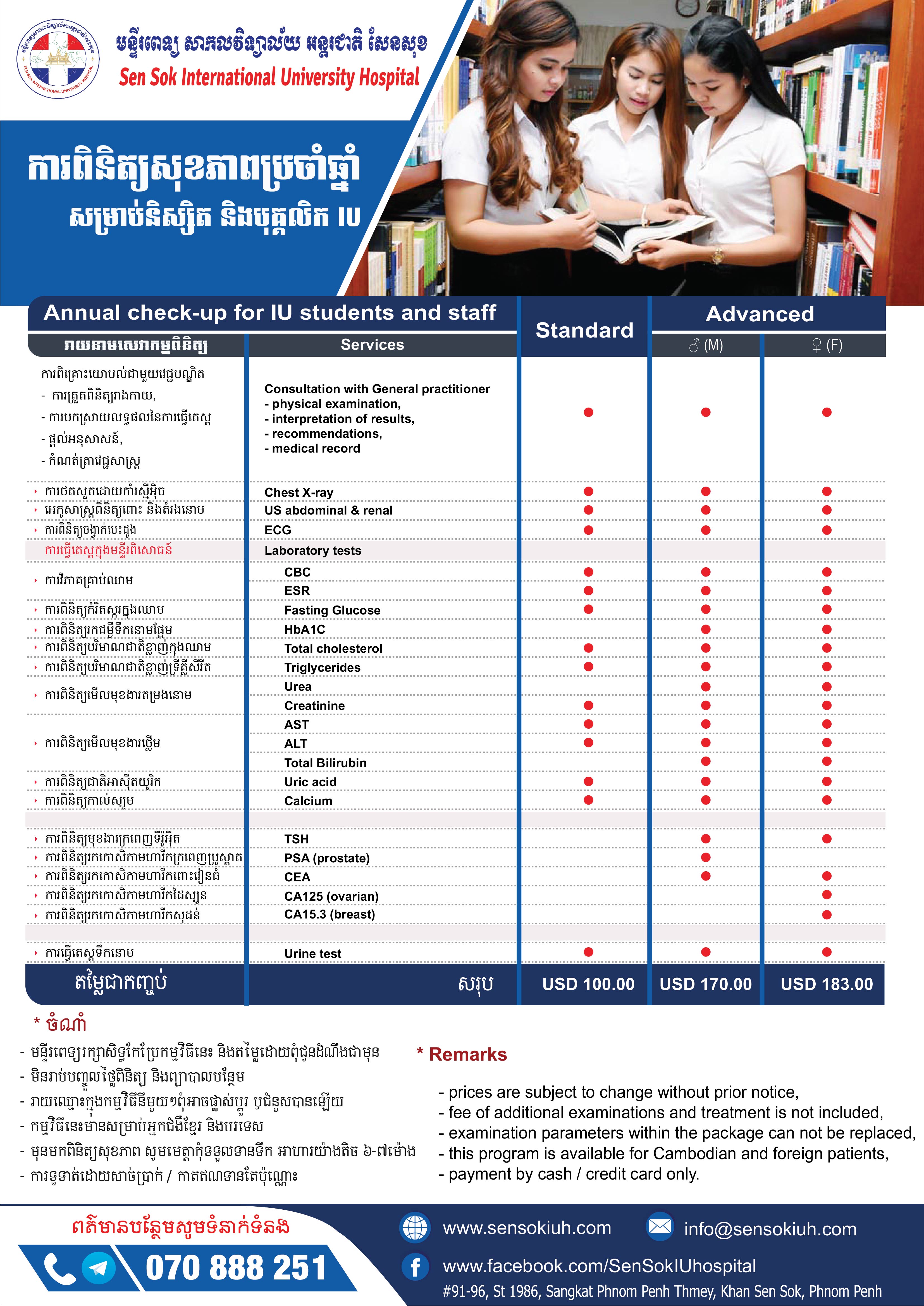 កក់ឥឡូវសុខភាពល្អ នាំមកនូវភាពជោគជ័យក្នុងការសិក្សា និងការងារ។ យើងផ្តល់ជូននូវកញ្ចប់ពិនិត្យសុខភាពពិសេស សម្រាប់សមាជិកគ្រួសារ IU ដើម្បីធានាថាអ្នកមានកម្លាំងមាំមួន និងស្មារតីភ្លឺស្វាង ក្នុងការសម្រេចរាល់គោលដៅធំៗរបស់អ្នក។